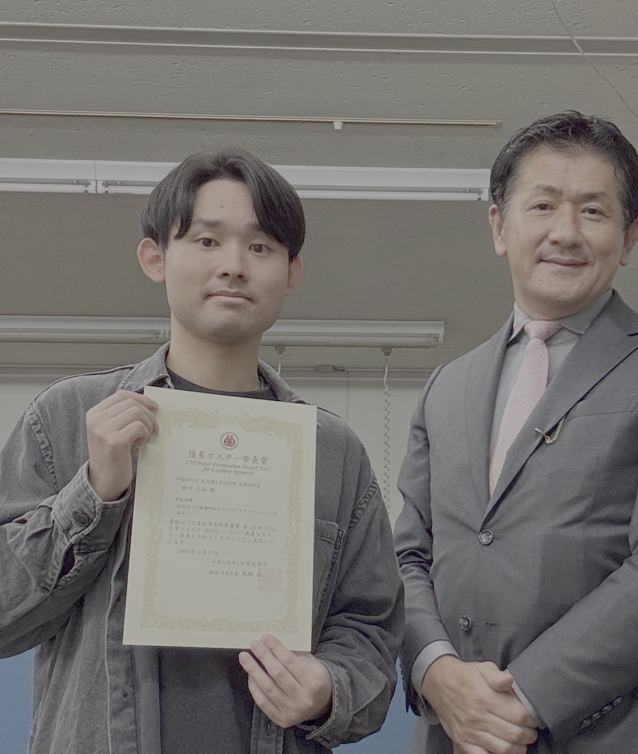 2025/11/28 M1の堀口くんが、日本化学会主催の第15回CSJ化学フェスタにて、優秀ポスター発表賞を受賞しました。